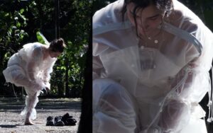 Genietta Varsi activating a “sweat suit” from her project Porosibilidades, São Paulo, 2023. Photo: Joao Machado.