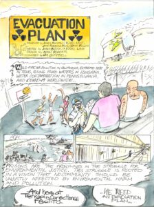 With this history in mind, we (David, Jane Robbins, Jared, and I) began to work with incarcerated artist Adam Roberts and his outside partner Craig (CM) Campbell, together called DrawBreath Studios, to create a long-form comic about a prison sited next to a nuclear plant. It tells the story of two men (and, occasionally, a radioactive goose) in an upstate correctional facility who begin wondering if their prison has an evacuation plan in case of an environmental emergency. Their investigation—through conversation, the prison library, and an ill-fated Freedom of Information Act request—shows some of the ways in which incarcerated people experience and fight against the environmental injustice of living in prison during the climate crisis.